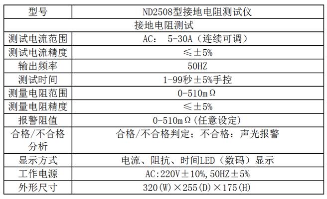 ND2508型交流接地電阻測試儀適合用于測量各種電機、電器、儀器儀表、家用電器等設(shè)備的外殼與其接地線之間的電阻值。