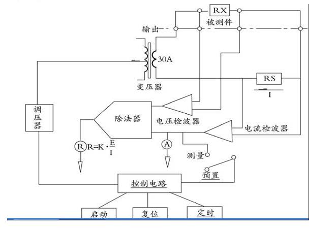3)接上負載,按一下“啟動”按鈕,調(diào)節(jié)“電流輸出”,來調(diào)節(jié)測試電流至規(guī)定值,即可進行測試,此時“mΩ”表將顯示被測件的電阻值。如果被測件電阻等于或大于電阻預(yù)置值,則儀器將超阻報警,蜂鳴器發(fā)出響聲,超限黃燈點亮,輸出電流被切斷,表示被測件不合格,按一下復(fù)位按鈕,解除報警,方可進行下次測試。如果測試電流超過30A,也會產(chǎn)生過流聲音警示現(xiàn)象。由于負載不完全一樣,測試時需調(diào)節(jié)“電流調(diào)節(jié)”至所需測試電流。