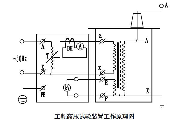 工頻高壓試驗(yàn)裝置的工作原理圖見(jiàn)下圖。