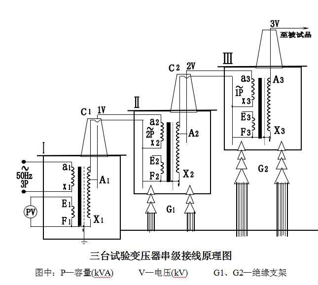 在上圖中,在第一級(jí)和第二級(jí)的每個(gè)單元試驗(yàn)變壓器中都有一個(gè)勵(lì)磁繞組A1、C1和A2、C2。在三臺(tái)串級(jí)試驗(yàn)變壓器基本原理中,低壓電源加在試驗(yàn)變壓器Ⅰ的初級(jí)繞組a1x1上,單臺(tái)試驗(yàn)變壓器Ⅰ、Ⅱ、Ⅲ的輸出電壓都是V。勵(lì)磁繞組A1、C1給第二級(jí)試驗(yàn)變壓器Ⅱ的初級(jí)繞組供電;第二級(jí)試驗(yàn)變壓器Ⅱ的勵(lì)磁繞組A2、C2給第三級(jí)試驗(yàn)變壓器Ⅲ的初級(jí)繞組供電。第二級(jí)試驗(yàn)變壓器Ⅱ和第三級(jí)試驗(yàn)變壓器Ⅲ的箱體分別處在對(duì)地為1V和2V的高電位上,所以箱體對(duì)地是絕緣的,試驗(yàn)變壓器Ⅰ的箱體是接地的。這樣第一級(jí)、第二級(jí)、第三級(jí)試驗(yàn)變壓器對(duì)地的額定輸出電壓分別為1V、2V、3V;其額定容量分別為3P、2P、1P。