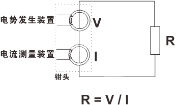 見(jiàn)下圖。鉗表的鉗口部分由電壓線圈及電流線圈組成。電壓線圈提供激勵(lì)信號(hào),并在被測(cè)回路上感應(yīng)一個(gè)電勢(shì)V。在電勢(shì)V的作用下將在被測(cè)回路產(chǎn)生電流I。鉗表對(duì)V及I進(jìn)行測(cè)量,并通過(guò)下面的公式即可得到被測(cè)電阻R。